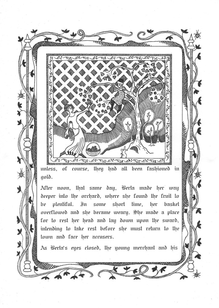This page is taken from The Great Book of Guardians of the Cave, depicting an episode from the Tale of Berta and the Scones. There is little doubt, amongst academics that this story is based on true events in which the Guardians played some part, hence the inclusion in this august tome. It is, however, probable that the actors and events in this Tale have been exaggerated and embellished through multiple retellings.
