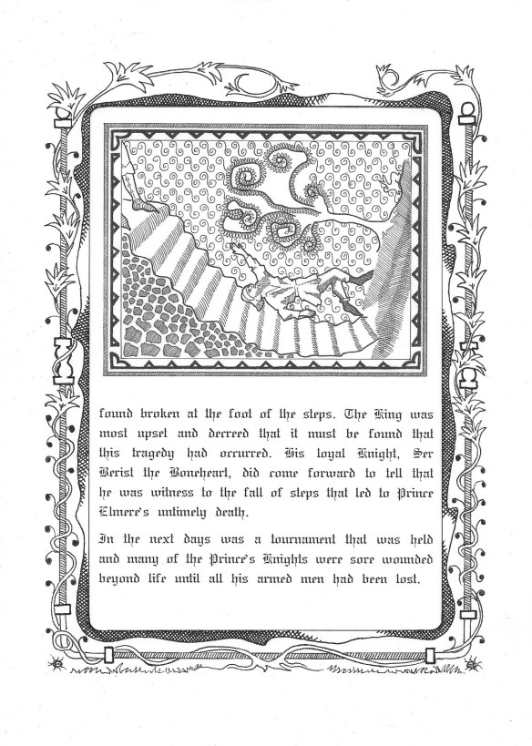 This is a page taken from the Book of the Guardians of the Cave showing the demise of Prince Elmere. It is clear from several sources that the King had his brother, Prince Elmere, killed to remove any opposition to his power. The knight Ser Berist the Boneheart apparently pushed Prince Elmere down a stone staircase near the great hall after the feast which was held to celebrate the coming tournament. The King subsequently covered up the murder and passed it off as an accident. Shortly after these events Ser Beris was sent on a quest to find the Simple Stone. It has been suggested that this was to prevent him revealing the truth about Prince Elmere.