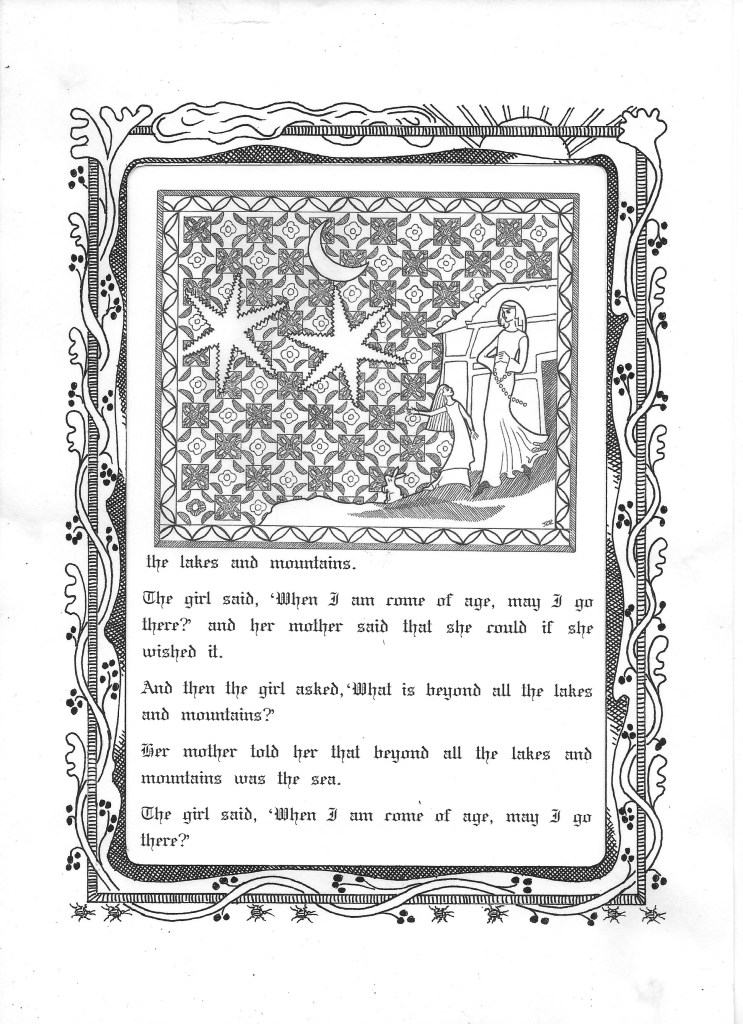 This is a page taken from the book of the Guardians of the Cave, it depicts a scene from the Tale of Curiosity and the Stars. This Tale comes from a series of stories which academics now believe were told to the children of Guardian’s families and should not be confused with the majority of stories which relate the real life exploits of the Guardians of the Cave. Another example of this genre is the Tale of Veracity’s Quest for the Truth.