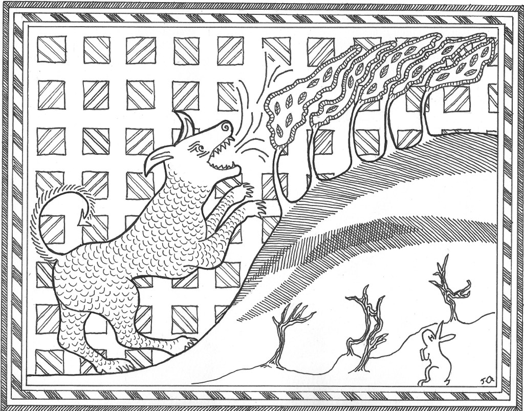 This is a page taken from the book of the Guardians of the Cave, it depicts a scene from the dream of Vivainne the Knight Exemplar as she slept by a well, deep in the forest. In this particular story she has two dreams, both are interpreted by a recluse that Vivainne meets in the forest and who shows her good hospitality. This type of dream story is often used to guide the knight and the reader in the morality and values that are seen as paramount to and honourable knight’s progress.