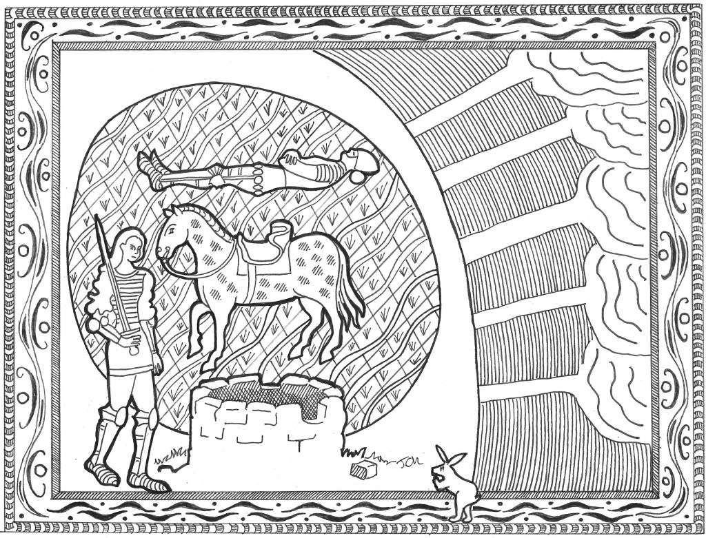 After some hours of time, she was delivered, sudden, to a place where the path that was required, shook itself free from the darkness of the forest and for a brief moment, made to cross a clearing wherein lay an old broken well. With a start Vivainne spied an armoured figure lying out upon the green, still and unmoving, positioned as if in death upon a tomb of stone. Dismounting in haste, she strode to the frozen figure and knelt by the shoulder. With her heart beating to burst she lifted high the knight’s visor and there, sure, discovered the beloved face of her Constance, quiet and serene. Vivainne reached out and touched her cheek and was straight way assured that Constance was in no way deceased as her flesh was warm and lively to her hand. Try as she might, again, she could not wake Constance from her reverie and soon came to understand that she must lie under some strong enchantment or malady to remain there so still and silent.