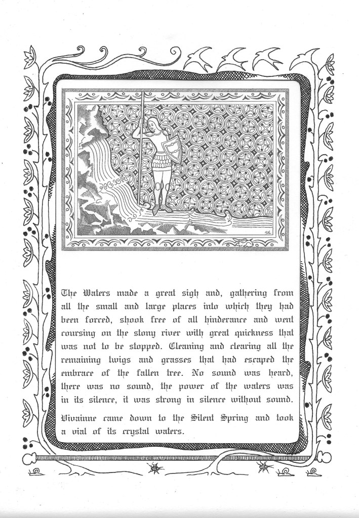 Came Vivainne, Knight Exemplar and Guardian of the Cave bringing her beloved Constance there on a drag stretcher, Constance was still and unmoving and quiet in her enchantment or malady and she must be enlivened by the waters, but first the waters must be free to run, to flow in silent strength across the stone of its bed of ages past.