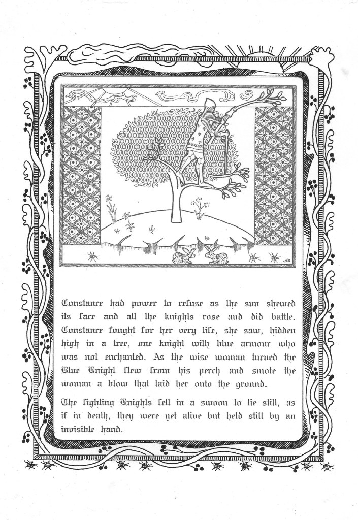 Constance felt no power to refuse and when the sun came out, she and the other knights that still remained alive, rose and did battle. As Constance fought for her very life, she noticed that hid high in a tree a knight with Blue armour who was not enchanted. When the woman turned, the Blue Knight jumped and laid out the woman with an swift blow. The battling knights there fell in a swoon and lay still as if in death. They were yet alive but were still held by an invisible hand. The Blue Knight vowed to take care of them until a remedy could be found that would revive the frozen knights.