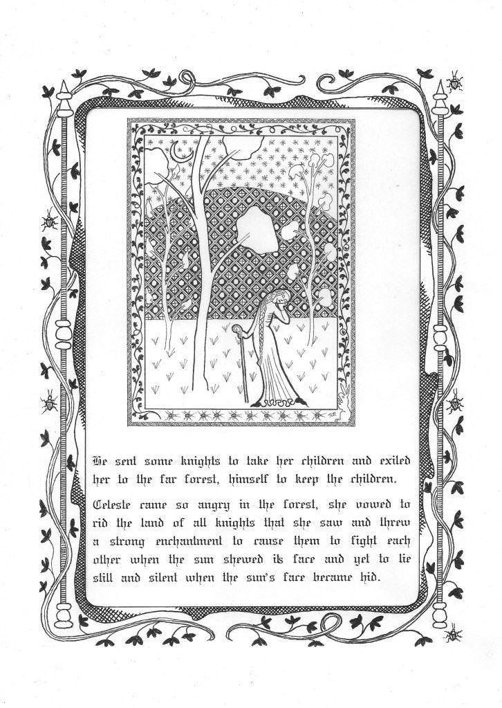 Celeste came so angry, she vowed to rid the land of all knights by throwing a strong enchantment to cause them to fight each other when the sun shewed its face and yet to lie still and silent when the sun was hidden.
