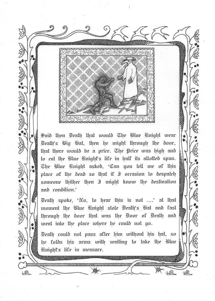 Death spoke, ‘No, to hear this is not …..’ at that moment the Blue Knight stole Death’s Hat and went fast through the door that was the Door of Death and went into the place where he could not go.