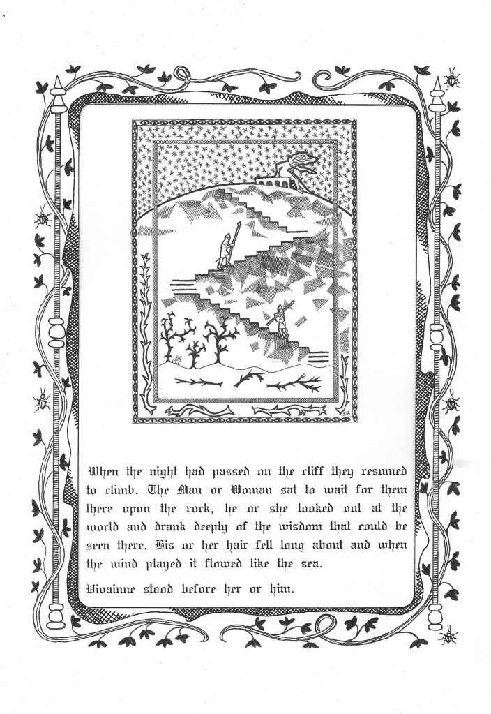 They came to the Rock whereon the Man or Woman could be found that Vivainne and the Blue Knight might be pure of heart and mind and full strong in mind and arm to gain the Island of Mists wherein the Book of Chivalry was hid. They stood down off their mounts and looked up the rocks so high and looked to see steps in the stone, carved hard in stone. All day they went higher over the rock to climb, up the steep cliff most high, the ground far below, the steps in cloud below.