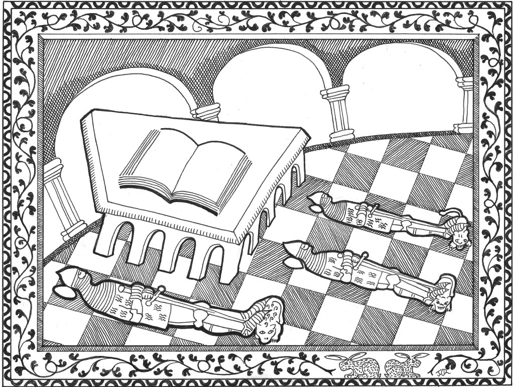 The hidden isle where they set foot was all in white mist and could not be found. They drew their sharp weapons and held up their great lances at these mists. Going forth into the place was found one stone building with many strong doors and rooms at their disposal. The guards who stood by to make brave challenge were all asleep with eyes fast shut and heads down. Vivainne and the Blue Knight entered at hearing some music which led them through the tall corridors. In a great hall, full beamed and with coloured hanging which did show scenes from the book, in it lay the Book with the Knights of Oblivion lay about with weapons drawn full in the light so had they lain this thousand year, waiting for a challenge or threat to their great book which did guide them.