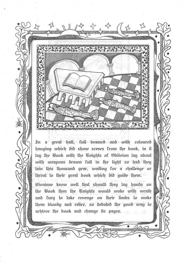 As they finished all the pages anew, which had took many days the Knights of Oblivion came free of their bonds but the work was done so that it could not be undone. The Knights forced Vivainne and the Blue Knight to retreat back whence they had come, not knowing that the Book had been changed. All soon went once more to sleep in guard of the New Book of Chivalry which they knew not.