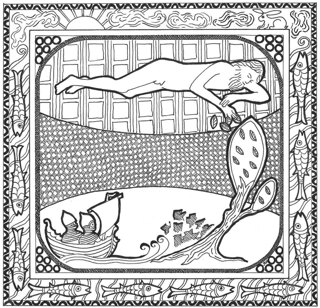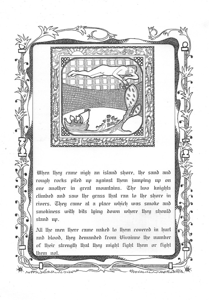 All the men there came naked to them covered in hurt and blood, they demanded from Vivainne the number of their strength that they might fight them or fight them not. It seemed the men had nought but leaves to eat and grasses to cover themselves at night. Vivainne and the Blue Knight told of the words in the book and the men asked what a woman is. Vivainne did show that which she was and the men there who lived said that was a new thing to them.