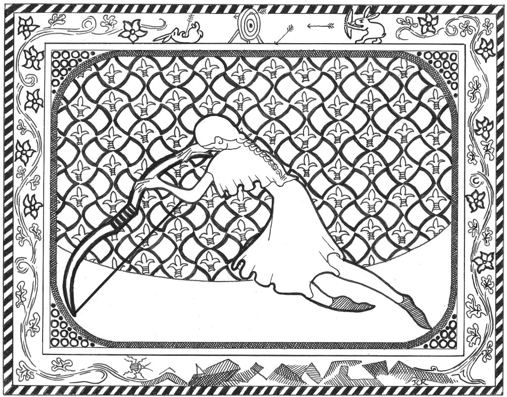 Constance bade the champions to restring the bow so that they might compete and that if they could not, then they would be considered unfit. So, each in turn wrestled with the great bow and although some amongst them were of mighty stature, none could restring the bow and must stand aside with head bowed. Then at last came to the bow Vivainne still seeming like a pauper in her old blanket and with her once strong arms much reduced in strength by the hardships of the voyage of The Book of Chivalry. At first it seemed as if the task would be far beyond her and the standing champions laughed, but using what little strength she had and enabling herself with the full skills of her experience, she then strung the bow sound and throwing off her blanket covering she stood tall and nocked an arrow in that bow. With an steady arm and releasing the arrow which passed through strait the bulls eye of the proffered target to bury deep in the post of a building some many yards beyond.