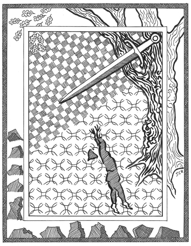 The child that he was yearned with all his being to grasp the sword because, in his youth, if he could grasp the great sword he would become a man in that moment. He standing, toes on the forest floor, could not reach. To pull a dead log by was hard but yet he could not reach, so must he to climb upwards. First to a small branch in his hand, again a branch and his feet coming up, many times, to the strong bough in which the sword was caught. Then, so slow, along the bough, so scared and yet so driven to take up this great weapon, that now a man, he would strike down the bad people who he knew not and be the best kind of man, or so he imagined. To touch the hilt of the sword and grab and fall to the floor, a man with weapons.
