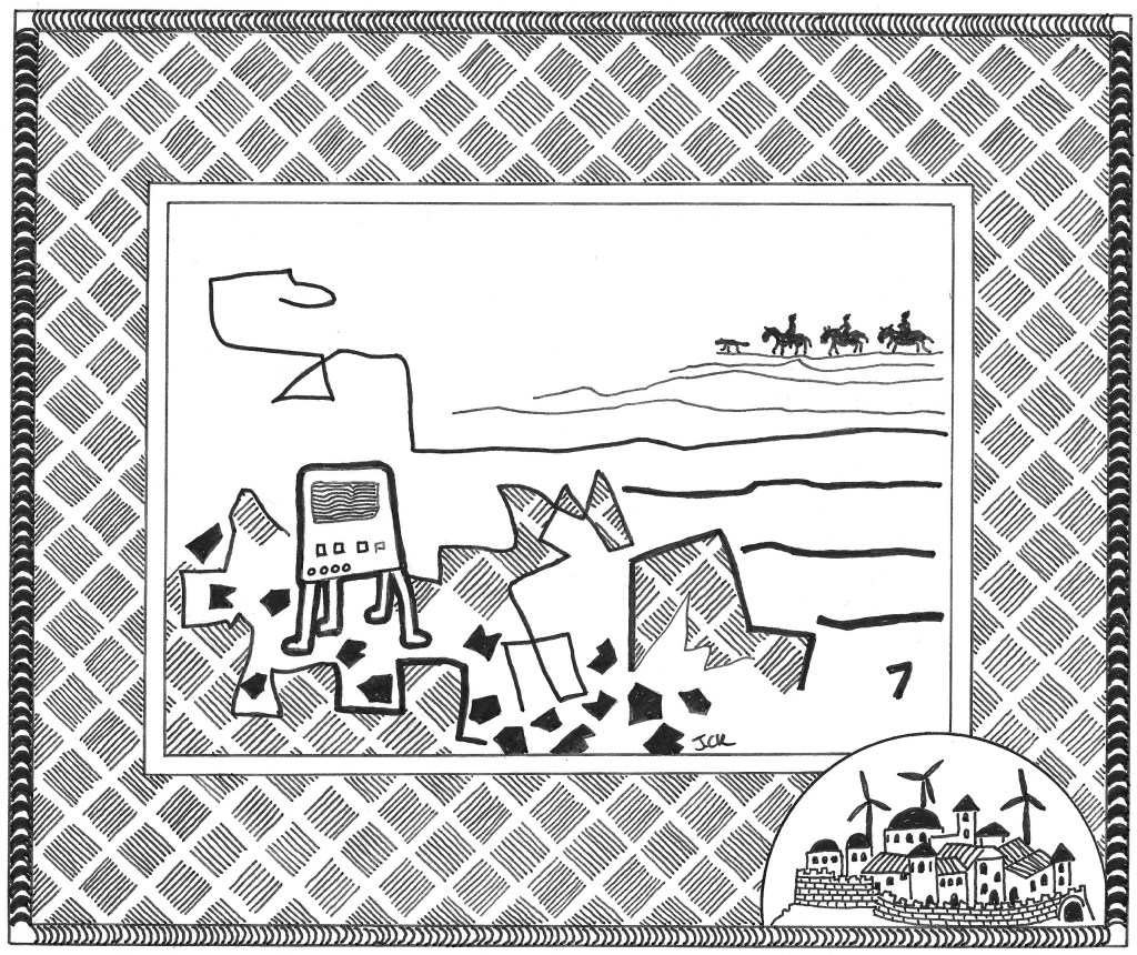 A noise of breaking or hard things at play came across the ridge and they must look. To the ridge they came and saw they knew not, a lump with legs, a chest of metal with legs of a chair but moving as alive, on its front some pictures came and went, always changing, pictures of many things. Walking and falling, falling, once, twice and more, always rising and falling into the rocks upon which it must move. They went to it and it stopped to move so much.