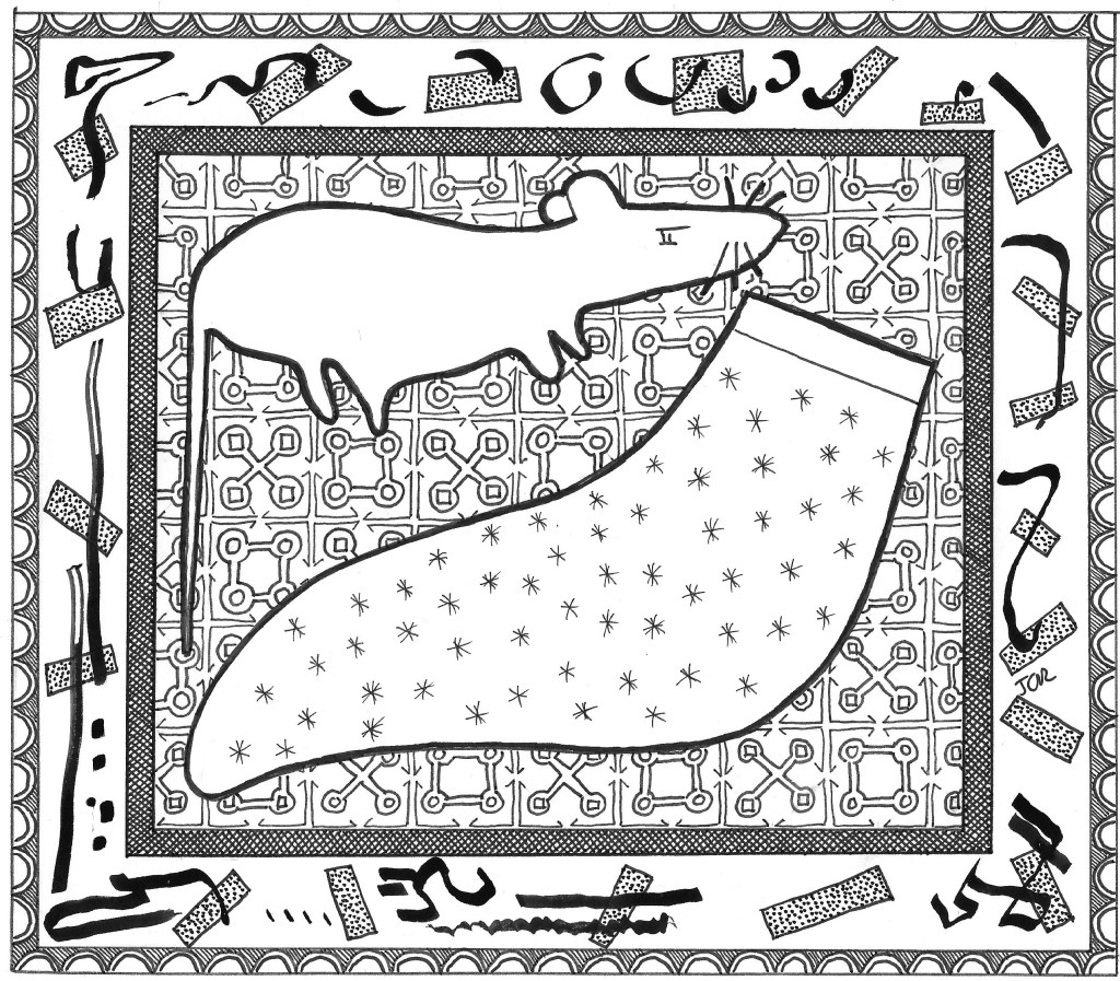Once in a time there was a dog or a cat or a giraffe or a mouse, who lived in a hole in the ground, and flew in the sky, on the grass, by the tree. It looked out or up and down around the corner until it saw the sock or triangle, where it lay withering on the road by the hedge under a cloud. The dog the size of a house, the cat with a never-ending tail covered in lustrous jewels, the giraffe with the fur of a bear and the tongue of a snake and the mouse chased each other continuously, day and night. Round houses in the desert by a field of wheat, they ran and jumped, swiftly and softly and quietly, until a rosy dawn broke over the trees and clouds by the hedge over the lake or sea or puddle or ocean. By a ditch.