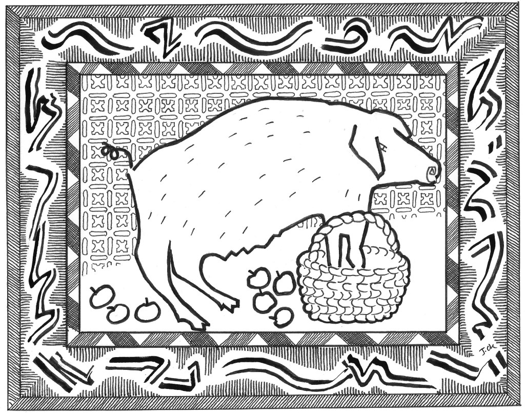The apples are in the basket, the pig loves apples. The pig decides to live in the basket. The basket says, No I am full of apples and anyway you won’t fit. The pig is disappointed and spills the apples out of the basket and puts one foot in the basket. The basket says, Really, and the pig feels foolish, but even so he puts another foot in the basket. This is not going to work, says the basket, Give up now to avoid disappointment. The pig puts a third foot into the basket and sways a little from side to side. The basket, visibly shaken and terrified by the creaking of its own structure stays silent. The Pig, with enormous poise, places his fourth foot into the basket. For a wonderful moment the edifice of the pig in the basket exists, but then something, maybe a breath of wind or the rotation of the earth, causes the pig to fall with a resounding crash upon its side on the ground, feet still firmly in the basket. I live in a basket, said the Pig. That, if I may say so, is stretching the truth beyond its known limits, said the basket, No one is a winner here.