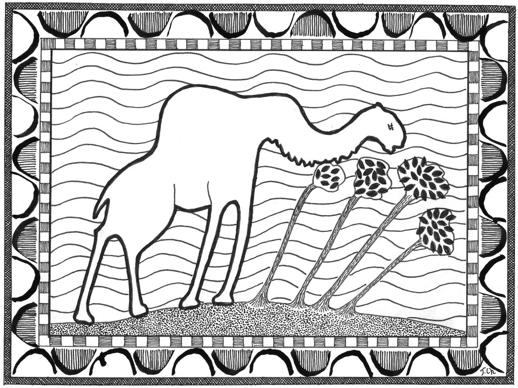 The camel, who had assumed that all the world was made of sand, walked close to observe the three things. The camel sniffed and licked and bit one of the three things.