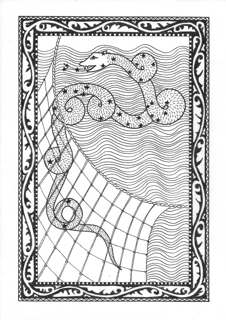 Many years gone by, spoke the woman soft, a knight and his fair companion rode upon a quest to rid the seas of a great serpent which made terror on the people there. They found a ship to take them out to open water where they intended to do battle and the sea dragon came fast upon them and dragged them down to the depths where the battle was fought. For some days and nights, the Knight and his Lady fought and fought hard and finally made fish food of the mighty dragon.