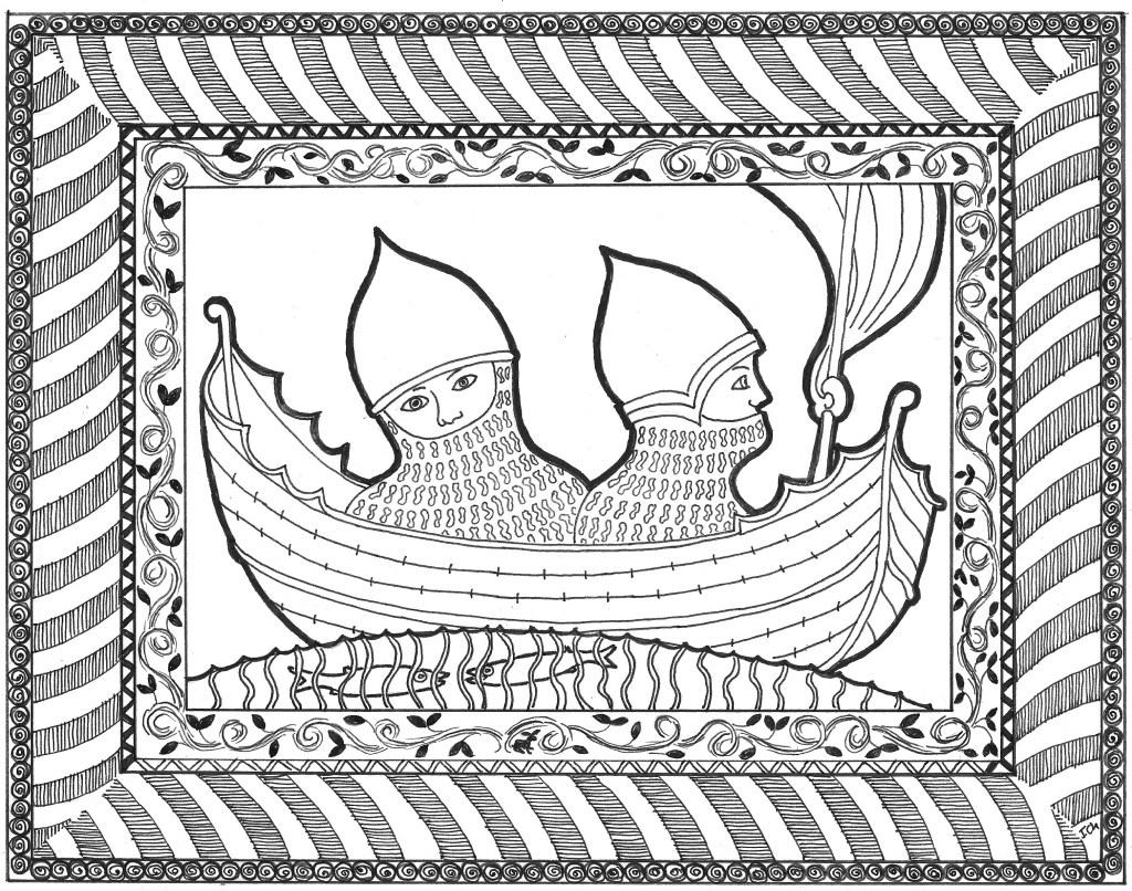 So, as it was time, the three knights made pavilion upon the rocky shore to remain. In the morning, early as the sea mist was strong about, as the knights stood watch upon the shore, the Blue Ship rose up from the depths and there, upon its decks, their friend, the Blue Knight stood alone with seaweed in his hair and eyes shining like pearls.