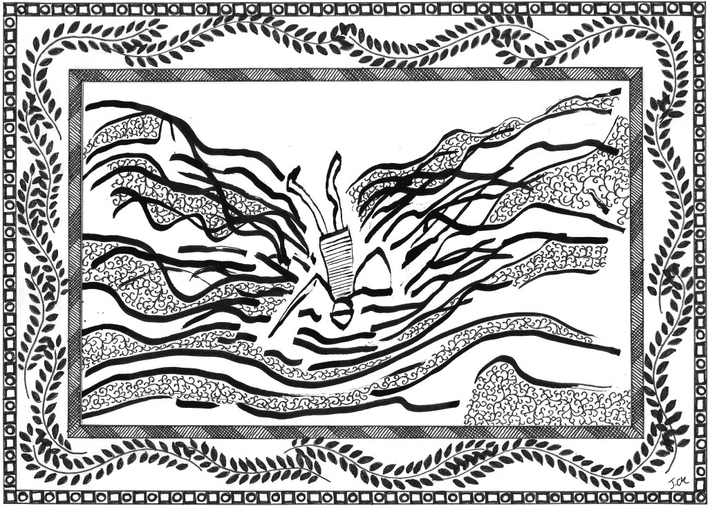 But it was not of the Blue Woman that the small fish was afeared. Over her shoulder, coming out the weed beds, coming nigh, a huge ugly head, the size of a small ship with teeth all awry, was a monster to strike terror into the hearts of any sea going being, fish or fiend.