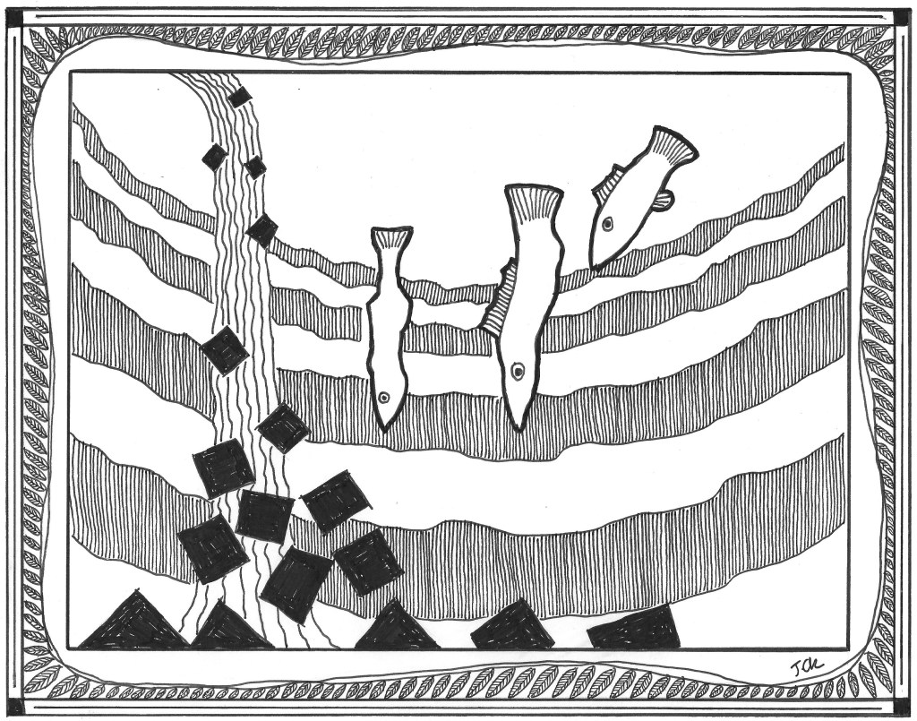 So she made the world to take a series of deep breaths and spit out all the bad stuff away. Then the world drew in a great breath so that all the stuff lying about was rattled and jostled and banged. The stuff became dislodged from its muddy house. Then the world let out the great breath and so that all the stuff having been loosed came rushing out upon the land once more and the water came clear and sparkling with life.