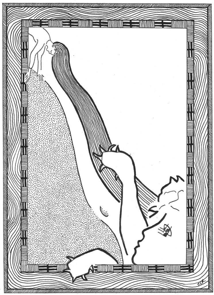 When the night had done its pass by and the stars had skimmed around their wheel of sky, the Sphinx and the two Blue Knights, full armed into the teeth, claws and spears and swords, climbed down the longness of Sheba’s hair, down across the belly of the Hill of a Woman and came in surprise and shocking. They came behind a line of lies which held each other in support as a skein of untruth. These were hard to see or make out clear, being there was no face and yet a face appeared but then a mask, and then just.