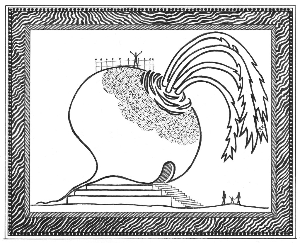 In the end, when it was all finished and polished and painted, all gathered in the clearing and a speech was made which nobody listened too as they were too excited. Then when the trumpeting trumpets had trumpeted, the curtain was dropped in and pulled away quite hard as it kept snagging on sharp bits outstanding, the monument was revealed, and a great roar of approval was heard. Some cried and The Darkest Knight fell in a feint of appreciation. The Raggedy Man, who had to be brought with his feet off the ground in case he disappeared in a straight line, looked over his should and pronounced, Wow!