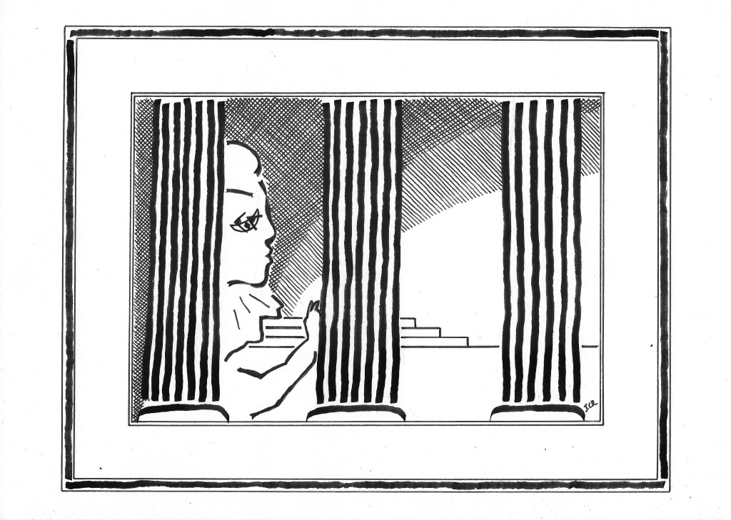 Travelling in the forest, making her way home, the Sphinx came to a clear place where in a Temple of stone was there. Old as the oldest things themselves, nonetheless, cleaned out with brushes and cared for. With wide steps up and grand pillars of painted stones to hold up the great roof, all picked out with horses and figures moving this and that along the facades. The fine entrance sweet with the smoke of braziers coiling and staining the walls there. The inside all dark with potential and sinister or not.