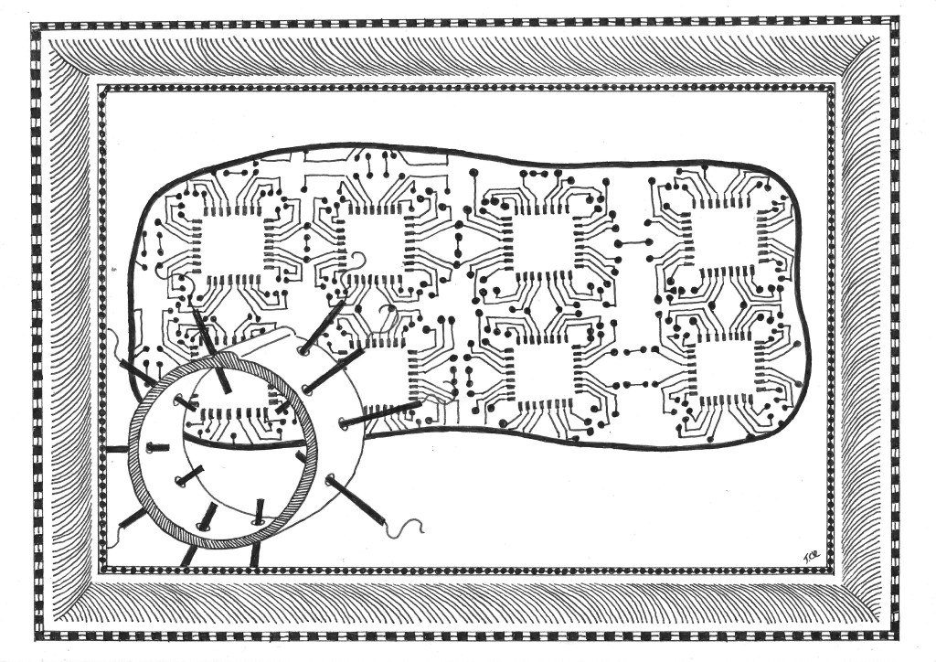 From the surface of the drum, escaping by the holes provided to relieve the pressure, rises unbidden, information extant the holes and along the streamers. This forms a dense cloud the colour of immoveable dirt on a white sock that has been involved in a hard-fought basketball match.