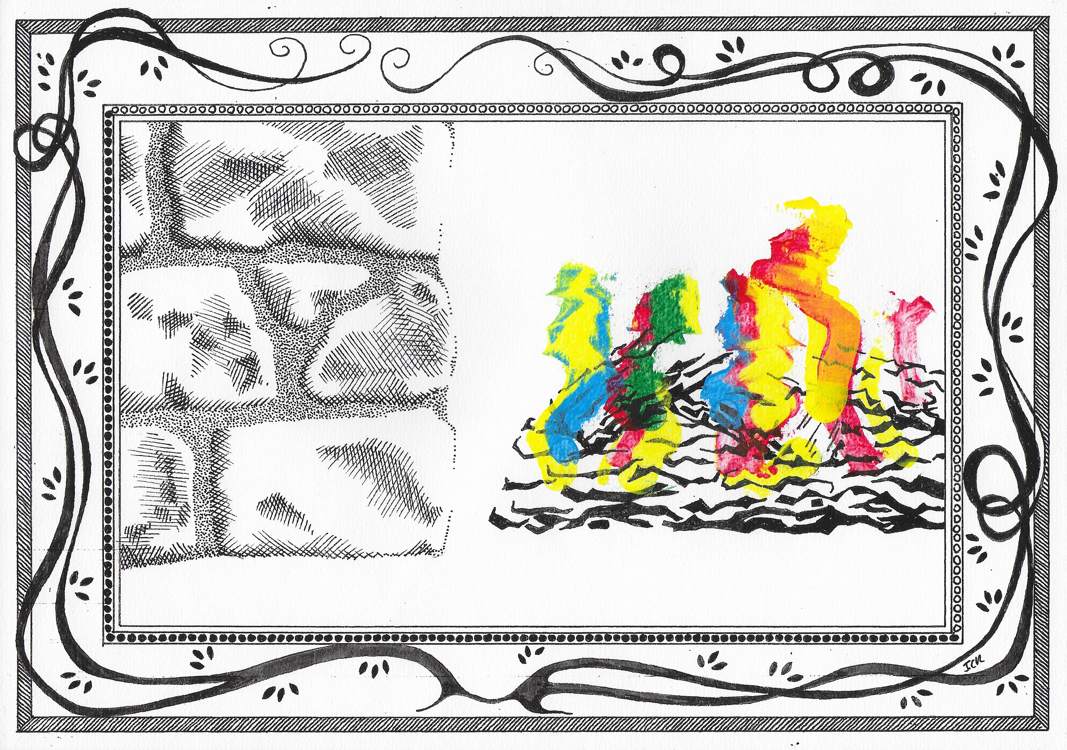They entered the City of Az, and there in the great hall a Fire had Also Been Laid. Here they held council. Constance and Vivainne, with Sheba and she Sphinx, also the Blue Woman Knight, who hold hands with her child Knight, looking very smart in small shiny armour, running amok with a hobby horse, were all in present that day.