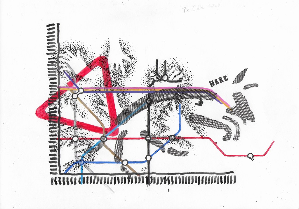 At the very last part, where one might expect the final countdown, storage shelves, emergency exit or services department, there appeared upon the high rocks a series of crumbly pictures, inscriptions and hieroglyphs, made with rusty colour palette and charcoal hues. Stylised animals rushing about, names scratched and chiseled artfully, with dates, recipes and rude signs. A pedantic map of a city, with a calendar or almanac, dates circled. The hand of an human in silhouettes sprayed, crossing and recrossing and an advert for deodorant pasted over some runic symbols peeping out.
