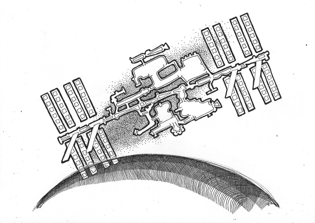 The ISS is made of shiny washing machine parts, television ariels, broken bicycles, recycled solar cells and second-hand TV sets. With re purposed water shoot tubes connecting the astros living and working spaces, all tied to a scaffolding pole structure with string, wire ties and robotic arms. It whizzes about the earth so fast that the weather cannot catch it. Inside, people, who all speak different languages at the same time and eat and drink out of plastic tubes, do experiments on spiders webs and tiny plants. On their down time they look out of the thick glass potholes and take pictures of the swirling patterns below with old fashioned cameras. The swirly patterns of the earth always spell shepherds warning. The astronauts have very big hair and round faces, their style of dress leaves a lot to be desired. It is written in their contracts that they must remain cheerful at all times, shake hands and hug endlessly.