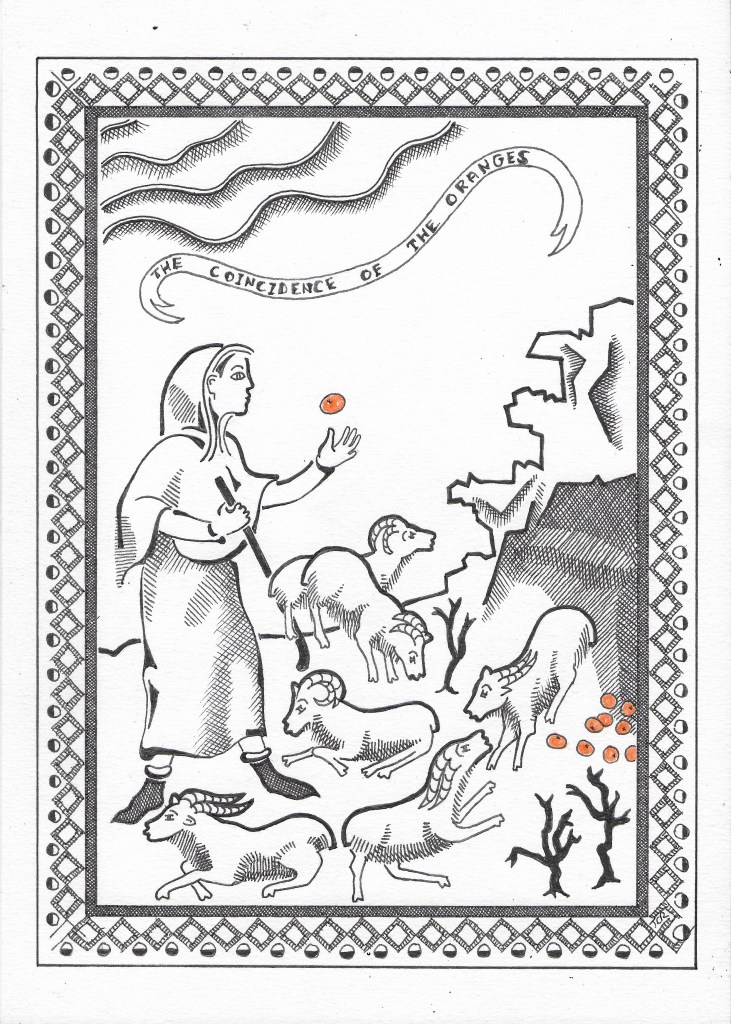 What is that now, spilling low from that little cave? Don’t look, come away my goats, come away, no, not in the cave, come away. Let’s not get involved, come, dance to my tune. Oh, now see, you had to look, now I must look also. Bright, no, bright orange oranges in the cave, falling out across the broken paving of rock. Not potatoes or potatoes, not apples or other, no, nor pears, no, too bold, too bright.
