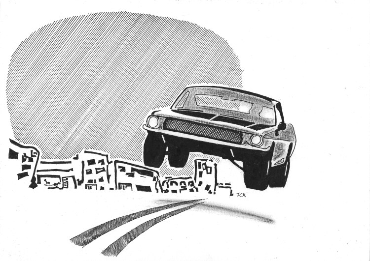 I considered using flash backs of my past trauma at this point, to provide a contrast to the ever-rising energy of the car chase. But I decided, hey, lets just get into it and floored the accelerator, pedal bin to the metal. The electric motor, silent until now, started to whine about something which I had no time for.